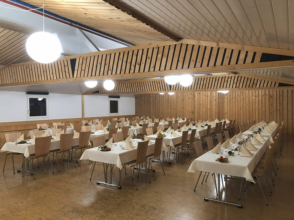 Unser Saal bietet Platz für 120 Personen. Die Fläche beträgt 150 m² bei einer Länge von 15 m und einer Breite von 10 m. Es sind 20 Tische (80 x 180 cm) und 120 Stühle vorhanden. Zusätzlich stehen 4 Bankett-Tische (76 x 183 cm) zur Verfügung.